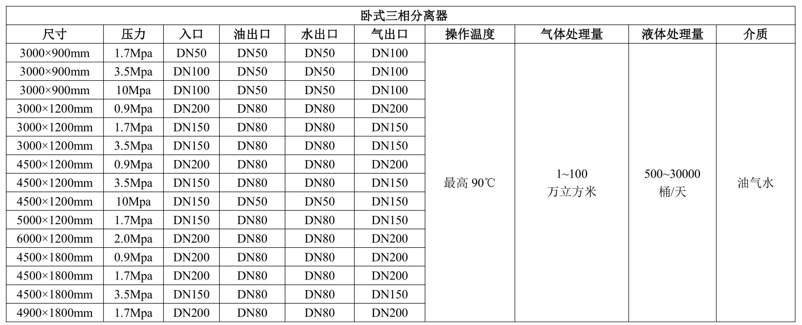 按照形態來分,油氣水三相分離器一般分為臥式和立式,臥式分離器通常用于較大的液/氣比流體的處理,或液/液分離。與立式分離器相比,臥式分離器的液體流動的水平截面積較大,不同密度液體的重力分離的垂直段較短。目前國內常用的的形態為臥式分離器。