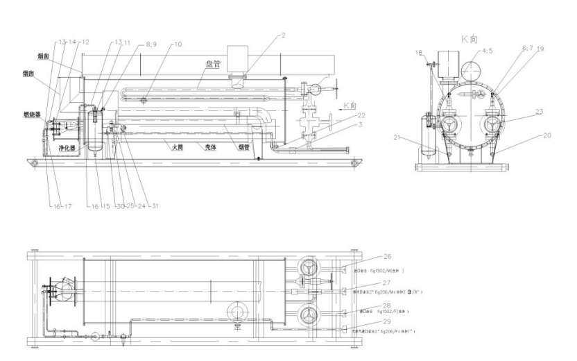 水套爐主體是指從兩端插入火管和工藝線圈的基本容器。燃燒器點燃燃氣或燃油,將其吹入火管加熱容器中的水,熱水加熱盤管中的介質,如原油或天然氣。工藝線圈在水中“沐浴”,這就是為什么它被稱為水浴加熱器。